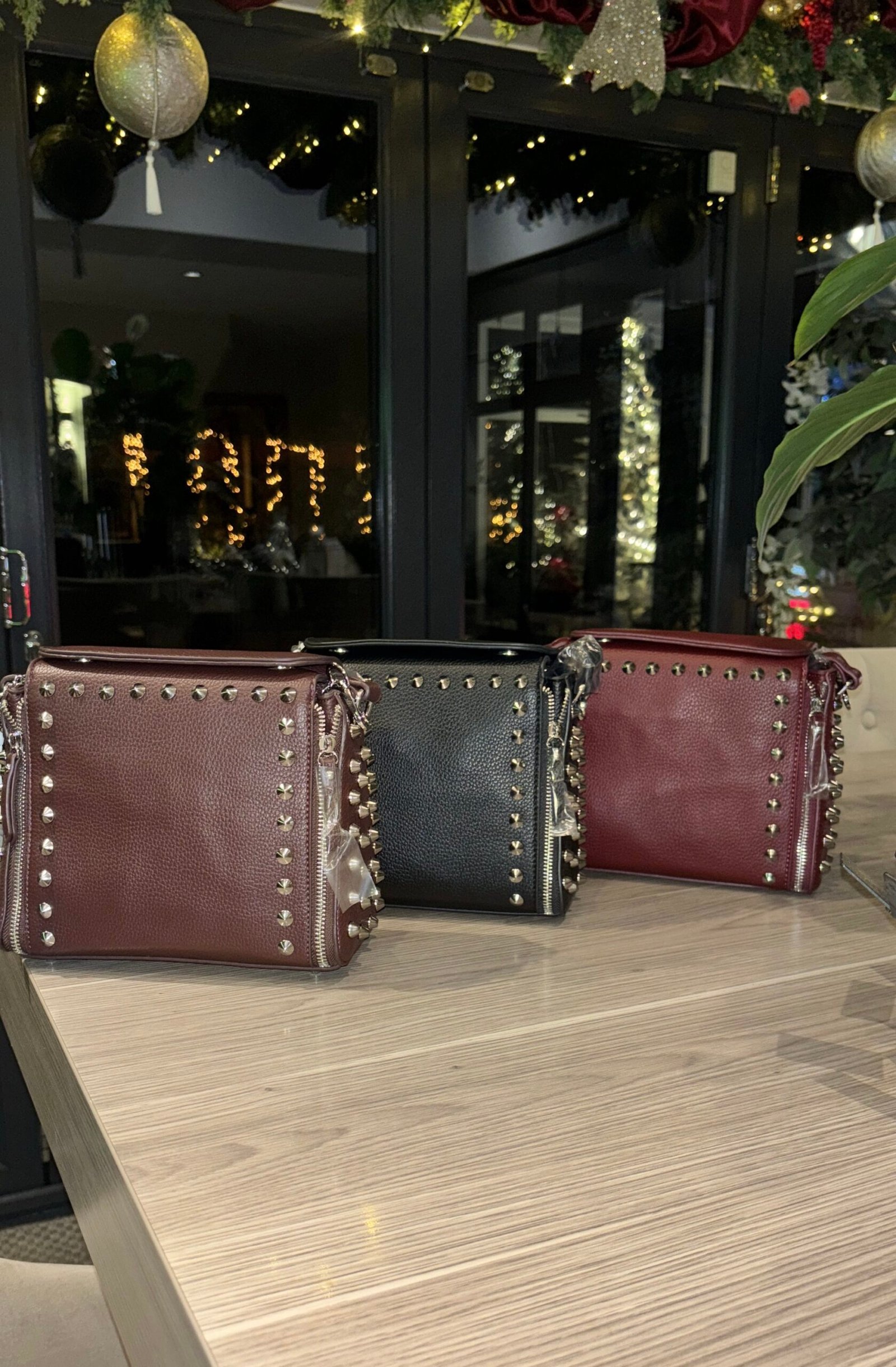 Available in brown, beige, and black, each bag features a sleek, structured shape with eye-catching stud detailing for the perfect mix of chic and edgy.